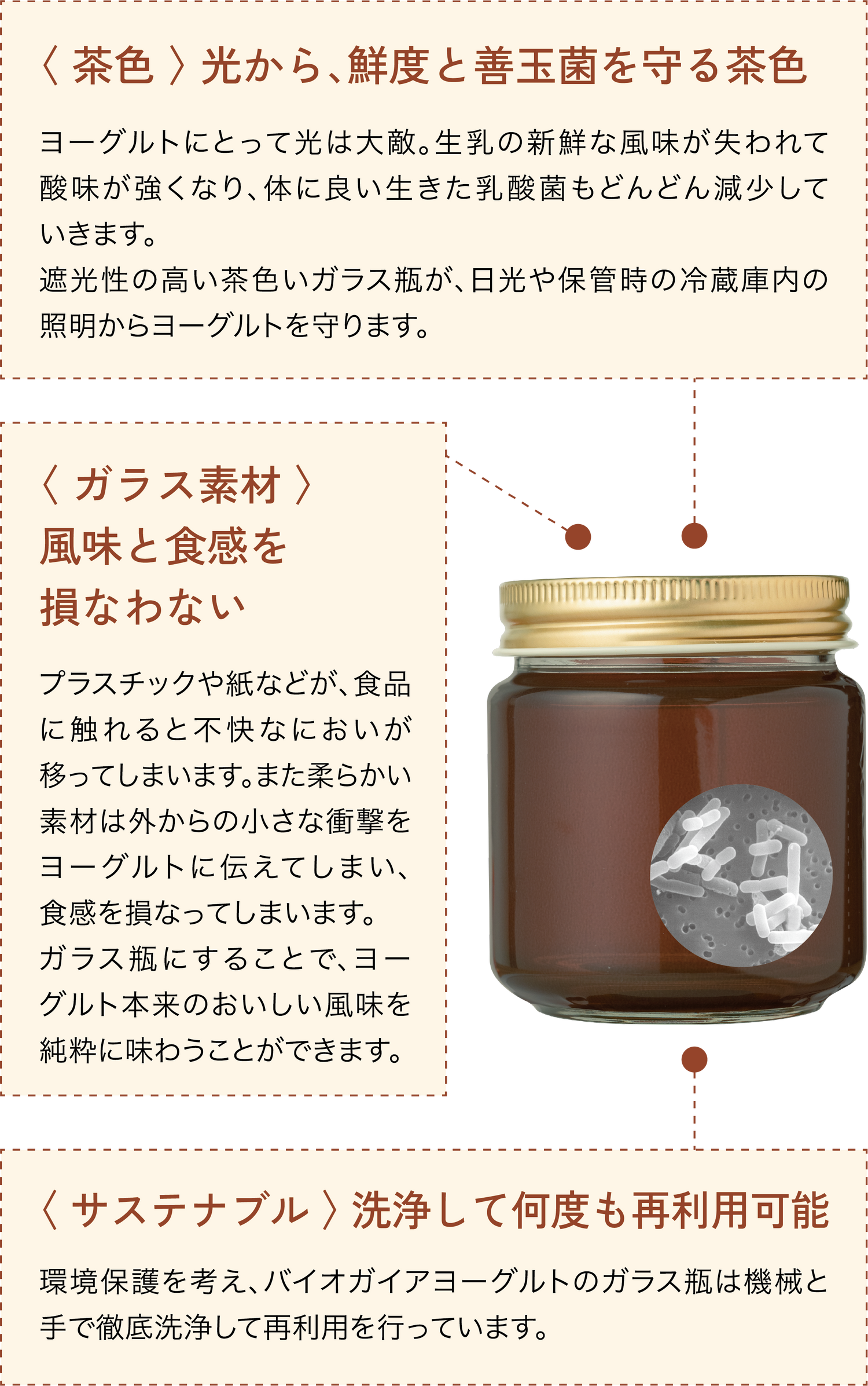 いつも新鮮なおいしさと元気な善玉菌を保ち、そしてサステナブルであるために、バイオガイアヨーグルはあえて茶色い瓶にこだわっています。